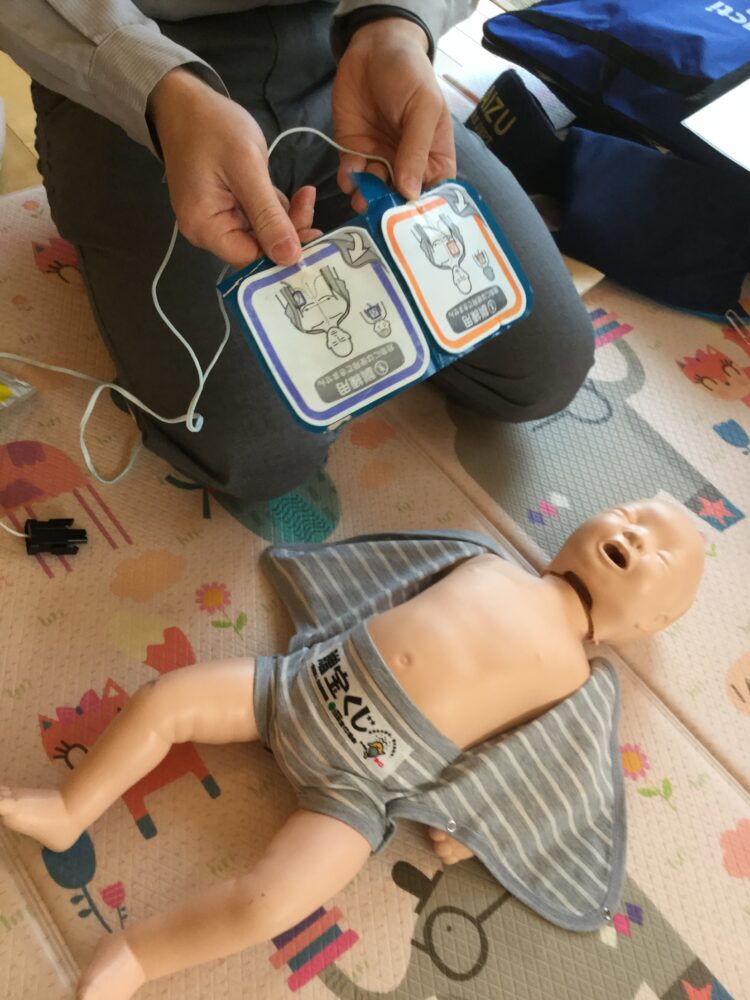 お子様の万が一に備えて、救命救急講習を開催しました。担当の救命士さんから、子どもに多い誤飲や水難事故による窒息についてお話しいただき、実際に赤ちゃんの人形で心肺蘇生法を教えて頂きました。
