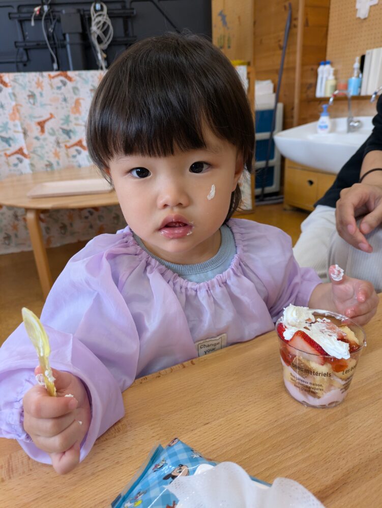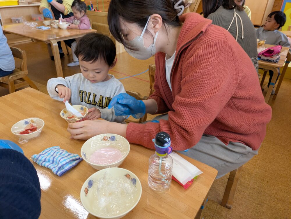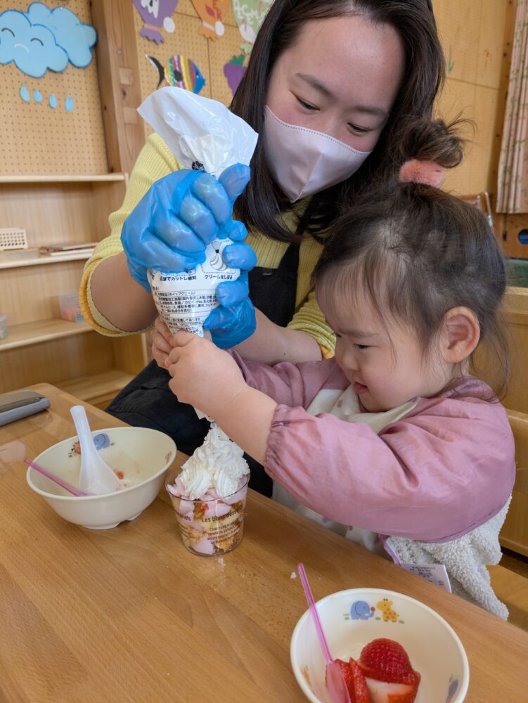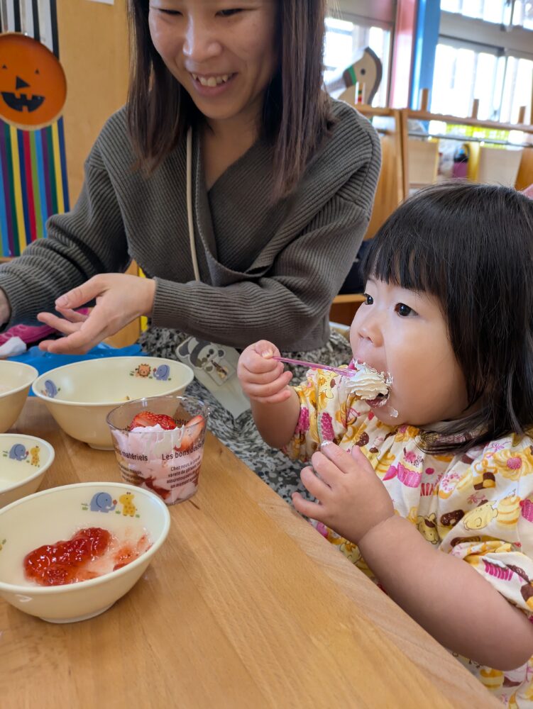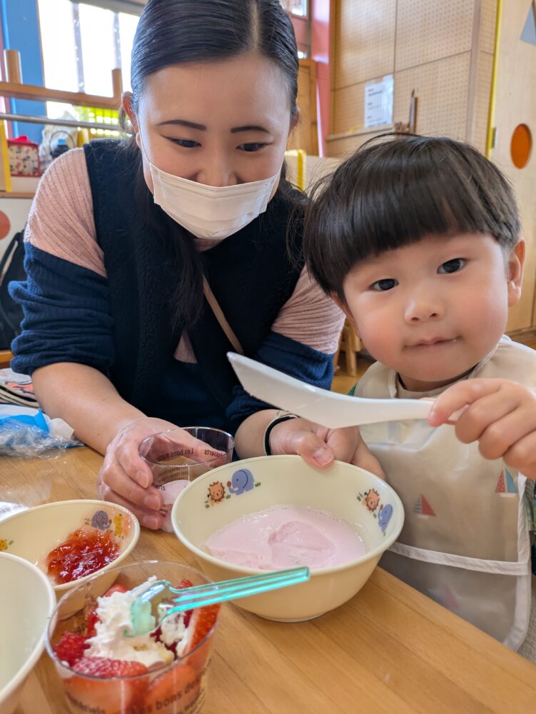 2025年度初めてのびーのびーのでは、昨年に続き、大好評だった『いちごパフェ作り』を行いました!今回も当園の給食を作っているミールケアさんにイチゴやいちごムース、ジャムなど用意して頂き、親子で楽しく飾りつけ☆彡小さいおててで上手にすくって、可愛いパフェの出来上がり♪お口いっぱい頬張る姿がとっても可愛かったです(^-^)
