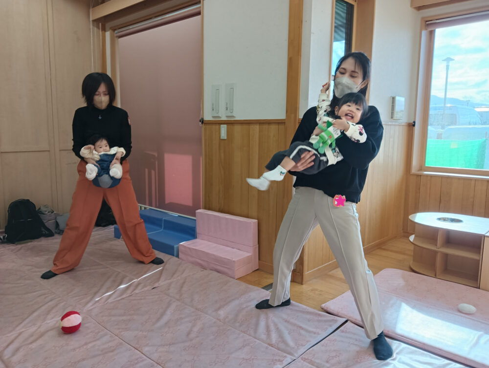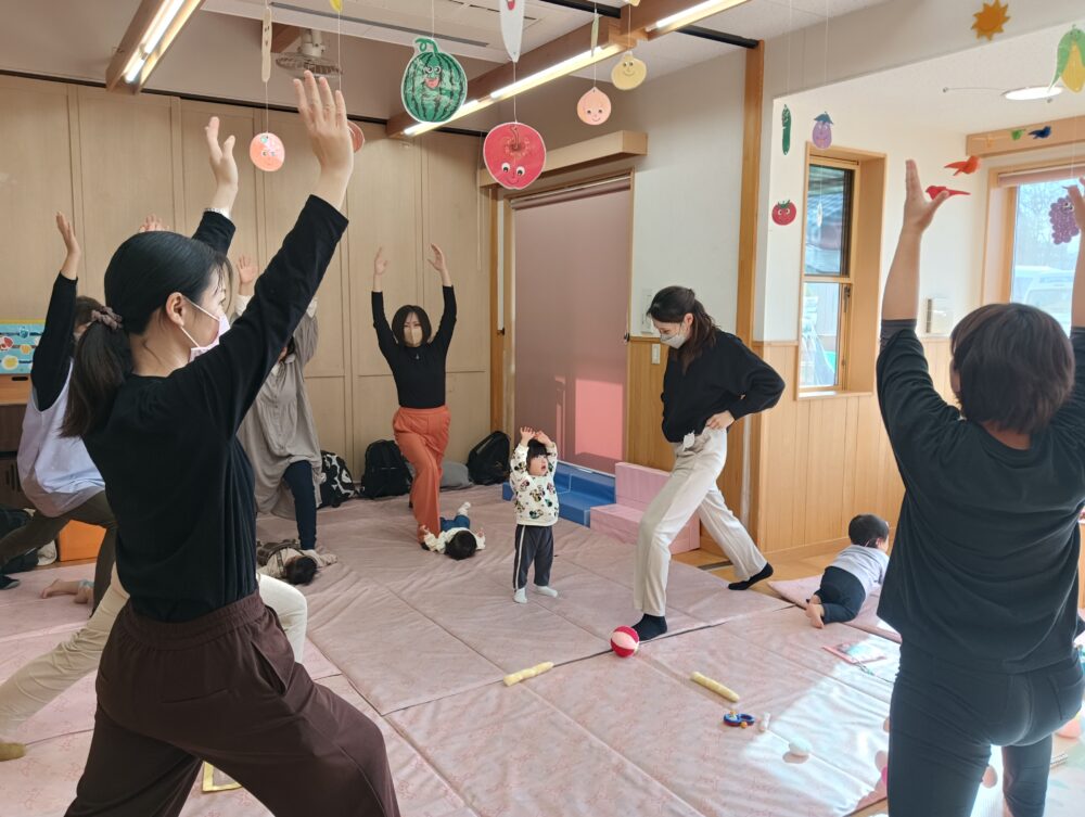 お子さんとのふれあいを大切にしながら親子ヨガを行いました。いつもの抱っことは違う抱き方や、オムツ替えのタイミングで簡単に出来るものなどを講師の尚美先生に教えて頂きました。身体も心もほぐれ、ママも赤ちゃんもリラックスに繋がれば嬉しいです。